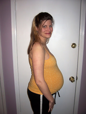 I really hope you're all enjoying a mental image of me whipping down some slopes in all my bulbous glory. :-) Fortunately for me and my Nibblet, the closest thing I did was attempt to don a ski bib to take Andrew out to see the incredible piles of snow (I think we got, like, 3 feet just while we were there). Aunt Jessie (Phil's brother's wife) is also expecting ... I think we look pretty hot.